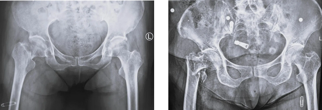 常见的老年髋部骨折有股骨颈骨折(左图)和股骨粗隆间骨折(右图)